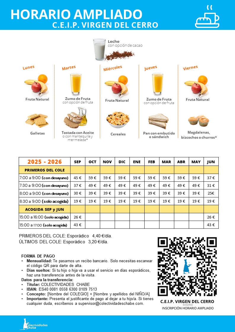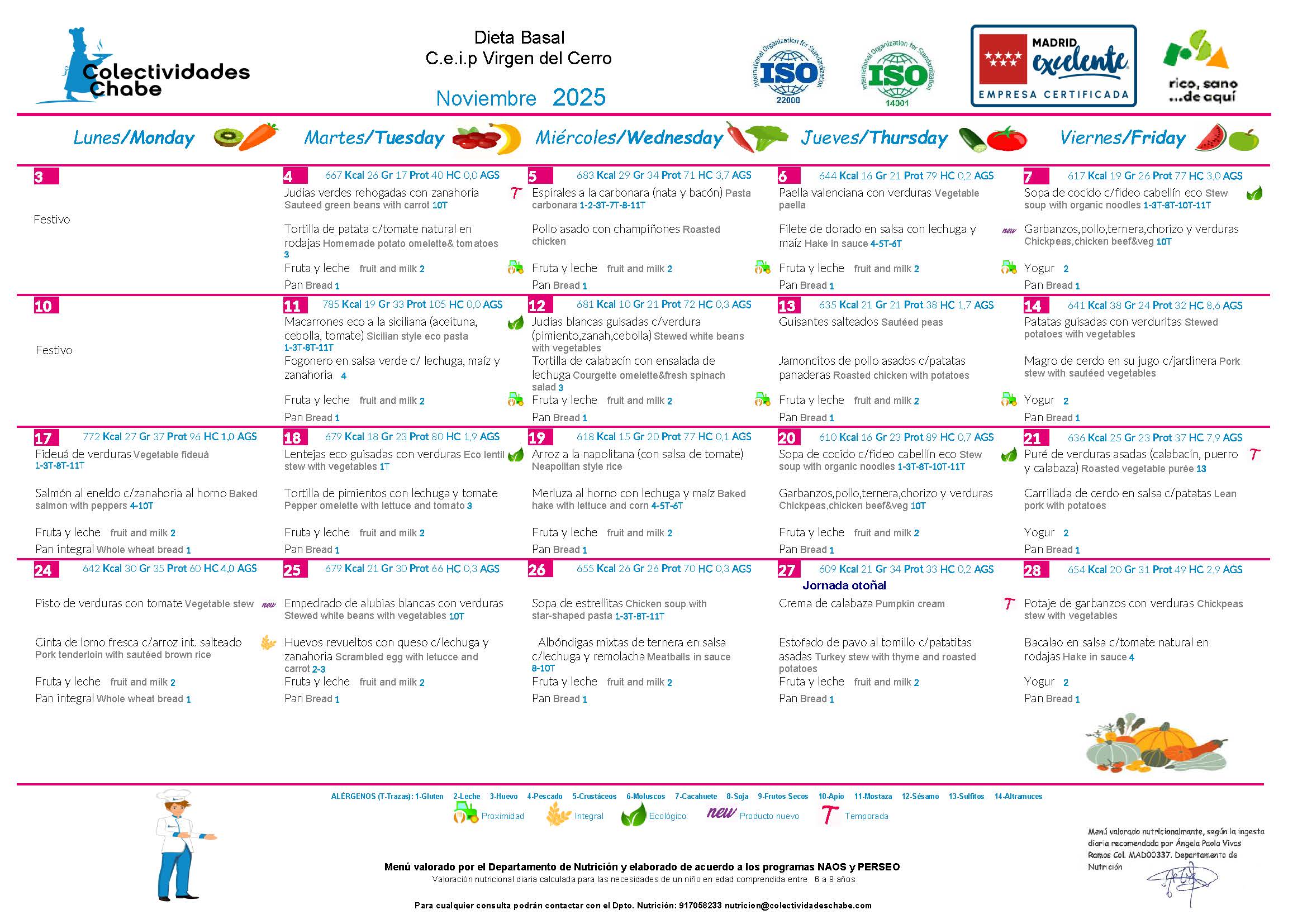 C.E.I.P. VIRGEN DEL CERRO C/ Mohernando, 1; 28038 – MADRID Menú Basal del CEIP Virgen del Cerro Descargar Dietas especiales del CEIP Virgen del Cerro Descargar Inscripción Horario ampliado